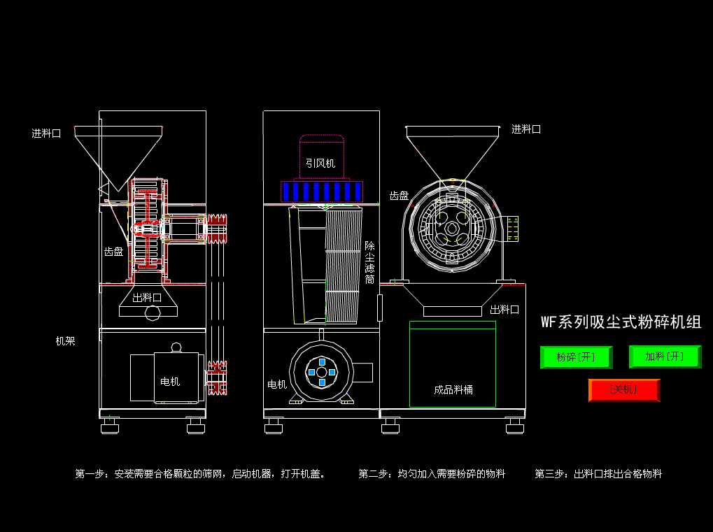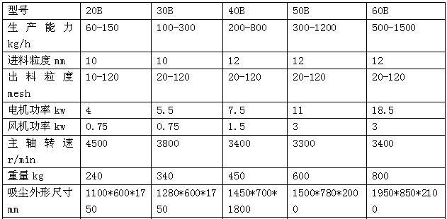 本機利用活動齒盤和固定齒盤間的相對高速運轉,使被粉碎物經齒盤沖擊、摩擦及物料彼此間碰撞而獲得粉碎。粉碎物可直接從磨腔中排出,經出料口出來,一般的物料經過粉碎后要經過棉布袋來收集,粉碎后的物料收集在袋內,空氣則從布袋的細小孔眼出來,不會將細粉排出,從而起到不浪費,不污染的效果。粒度大小由更換不同目數的篩網決定。本機結構簡潔、堅固,運轉平穩(wěn),粉碎物料快速、均勻,效果良好。