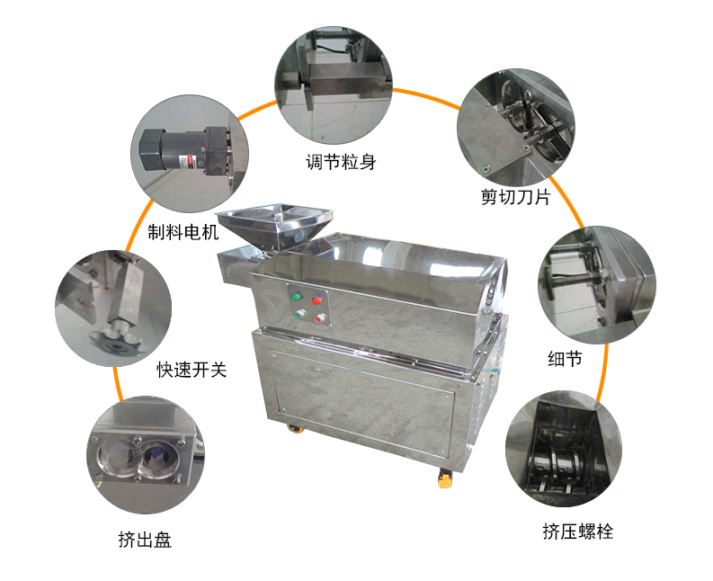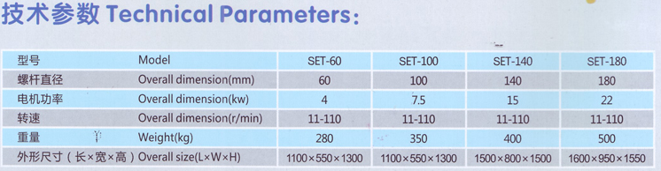 SET系列螺桿擠出造粒機擠出形式有前出料和側出料兩種。經混合、捏和的濕物料或低軟化點(一般指小于50℃)物料在螺桿輸送、擠壓作用下,從機頭開孔模板擠出,再經過干燥或冷卻得到顆粒成品,從而實現將粉狀產品改變為均勻的顆粒產品的目的。顆粒形狀為圓柱狀,成品顆粒直徑可由摸板開孔孔徑調節和控制:側出料為0.7-2.0mm,前出料為1.5-12mm,成粒率≥95%。