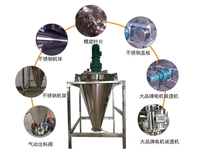 該機(jī)為單螺桿加S式漿葉組合而成,攪拌范圍大,混合速度快。無(wú)死角、對(duì)比重懸殊、混配比懸殊的物料混合更為適合。